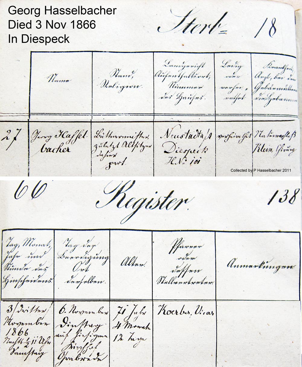 Pfarrer oder dessen Stellvertreter: Korber, VicarDeath Register 1866, Page 138