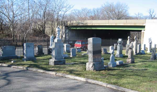 I found myself looking in the low numbers of this old map on the wall that I photographed. Nothing was making sense. I came to realize that what the cemetery did was to create new space for interments in the previously undesignated ground just adjacent to the fence. That is Section W1a. Here is what that area looks like today. You can see the Garden State Parkway in the background, and S. Orange Ave. [I find myself thinking how many times I have driven across this bridge without knowing how close I was to my ancestors. I wonder if my mother knew?]