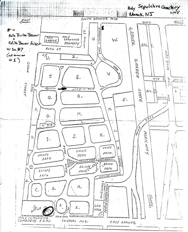 When I visited the cemetery in 2007, I was given the following map where "X" was said to mark the spot. However, the grave numbering system was confusing, and it took me a while to figure out where I was supposed to look. The secret is that Section W1a is not the same as Section W1. I will do my best to make it easier for you.