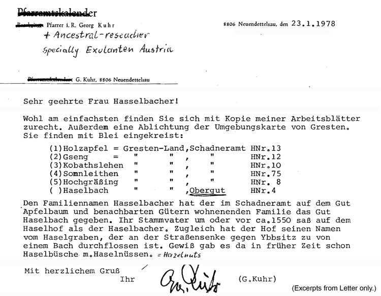 In addition to listing the properties with which Haselbachers have been associated in church records, Pfarrer Kuhr (in a difficult to translate first sentence) concludes that the Hasselbacher farm (Gut Haselbach) gave the family name to those families living in the Apfelbaum and neighboring properties of the Schnaderamt. [To paraphrase further,] your patriarch around or before 1550 sat on the Haselhof as a Haselbacher. Furthermore the farm shared its name with the Haselgraben through which the road and stream descend towards Ybbsitz. In those earlier times there would have been hazelnut bushes with hazelnuts.