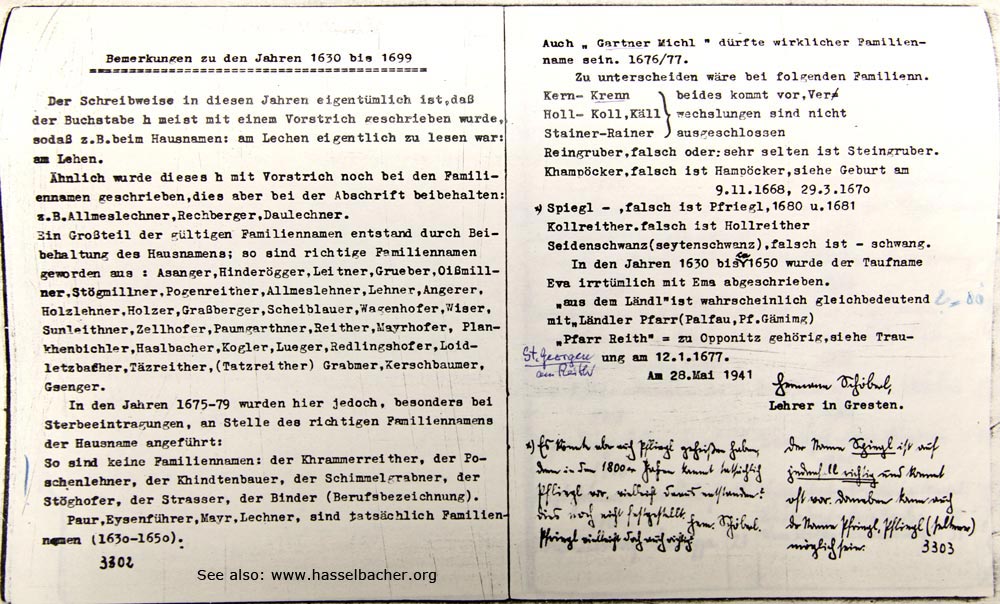 I recently found a document at the GFF in Nürnberg that puts this assumption on a more scholarly basis. In the 1940s, a teacher from Gresten named Hermann Schöberl transcribed the old church books of 17th century Gresten into modern (and therefore readable) German. Examples of his work can be seen elsewhere on this website and were important for the family historians of Franconia. It is probably fair to assume that no one in the 20th century had a better understanding of the names and family structures of old Gresten. Herr Schöberl also had the advantage of the fact that the centuries-old farm names were still being used in Gresten.