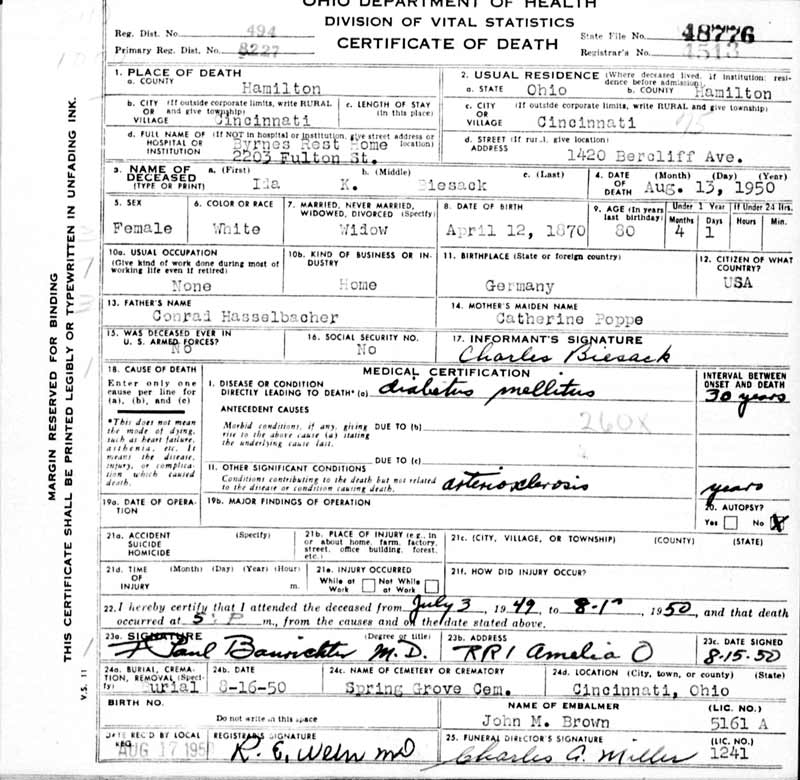 The death certificate is signed by Charles Biesack,but I do not know who that is. To my knowledge Kunigunda and John had two children: Karl born 1902, and Katherine M. who married a Mr Albiez but who by report of family did not have any children. This could well be incorrect.