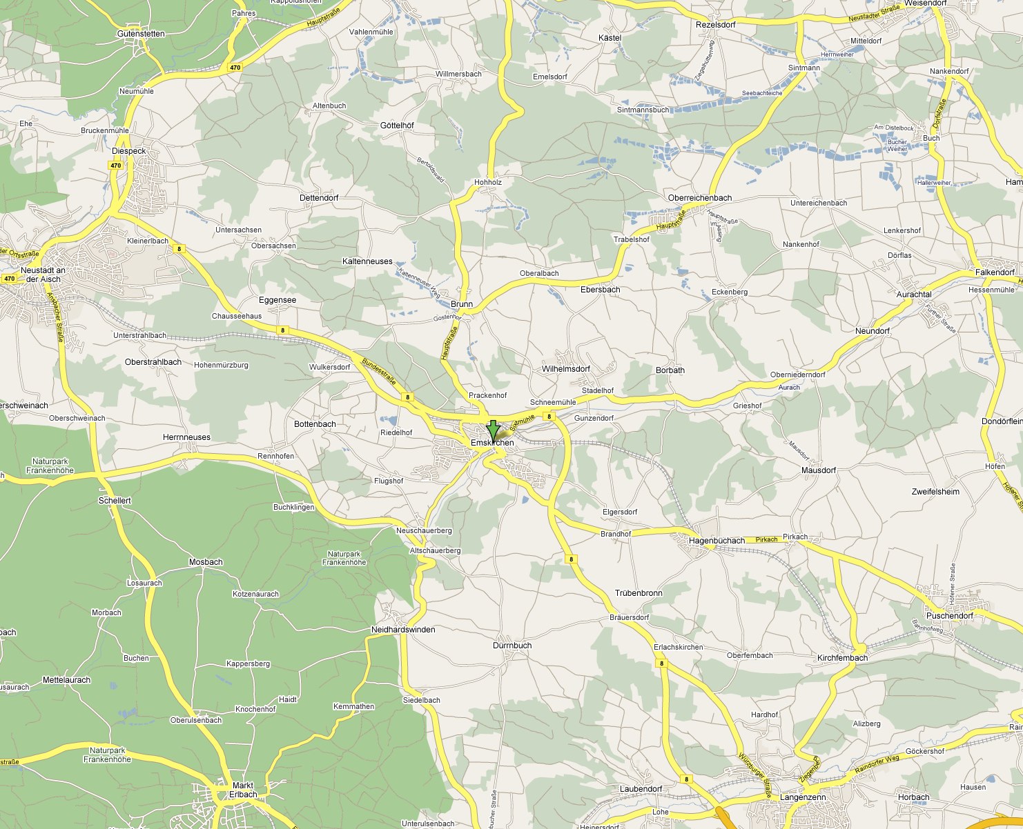 It is from this area that Johann Peter Hasselbacher and his wife Eva Maria Gundaker emigrated to Illinois in 1857. Peter, as he was called, was born and schooled in Gunzendorf. This area was populated early by Hasselbachers. Just as one of the sons of Paulus the elder sent progeny to Stübach and Diespeck, so did son Adam, who was born 1698 in Oberroßbach, settle in Wilhelmsdorf and Gunzendorf. Offspring from this branch of the family lived in Emskirchen, Herzogaurach, Puschendorf, Langenten, and Fürth. See the Geographic Map of this area elsewhere in this map section. A map of a wider area is also available here. |
