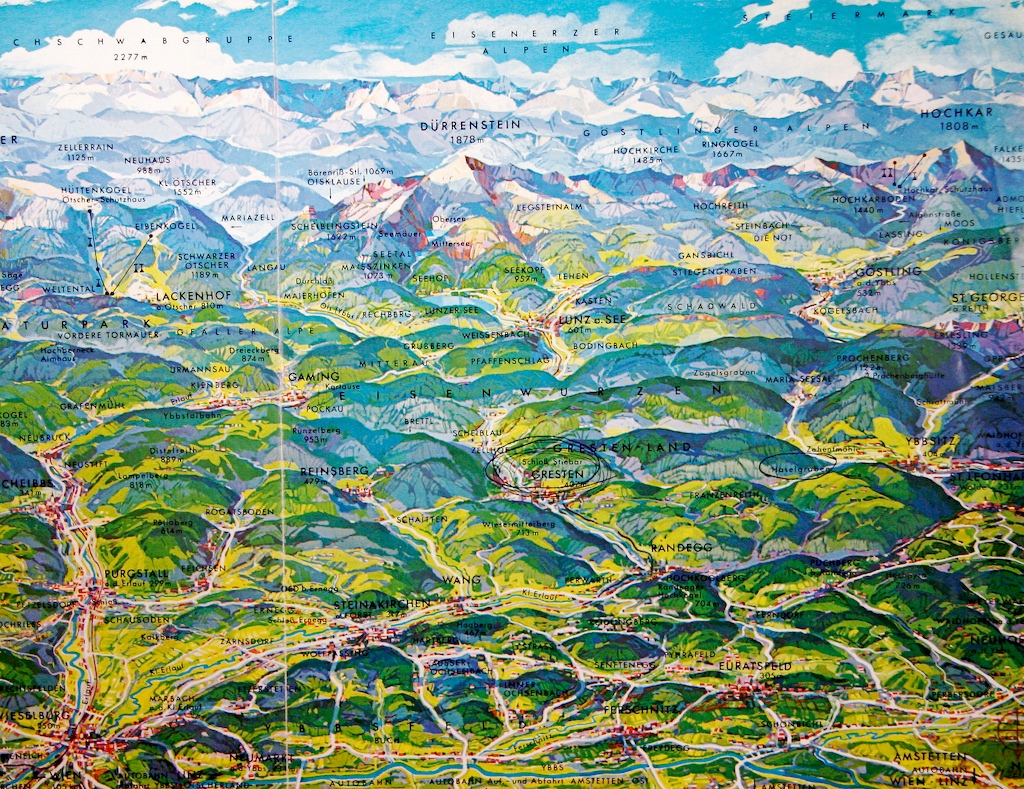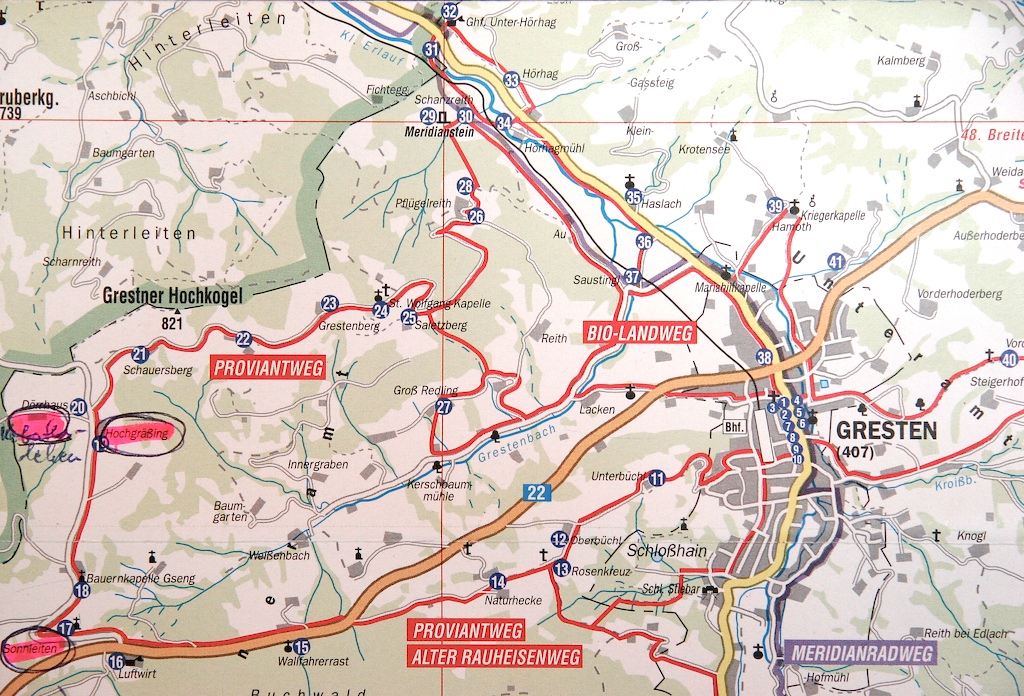 | The map below has North at the bottom. The Haselgraben is circled to the right of Gresten. The actual view from the Sonnleiten area can be seen here. |