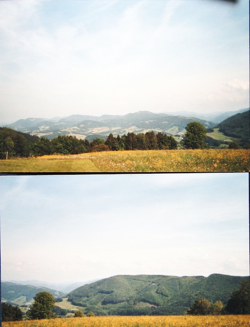 These are the views from the Sonnleiten farm. I am not entirely sure which is to the north and which the south. The southern view should be the more mountainous. The photo was provided to me by my cousin Annemarie.