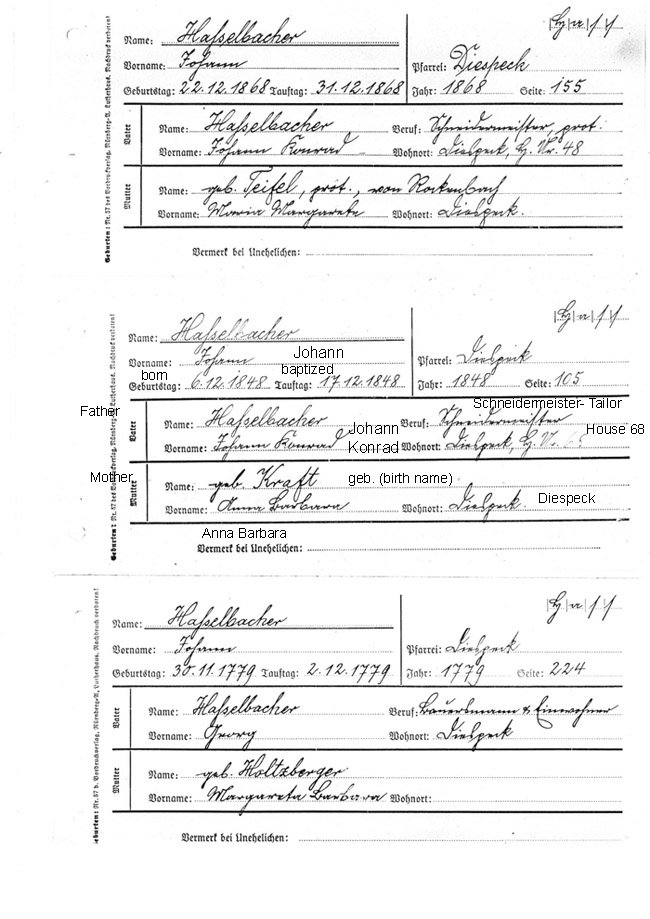 The lower entry for an earlier Johann is the son of my 6xG Grandparents. His father, Georg, was one of the very earliest if not the earliest Hasselbacher in Diespeck. He was a Bauersmann and Einwohner (farmer and inhabitant of Diespeck). The top entry is for my Great Grandfather Johann whose photograph is seen elsewhere in these pages. I have his watch, some photos, a short home movie from the 50s and nothing else. His father, Johann Konrad Hasselbacher, was the brother of the Nebraska Johann. (They sure did recycle those names!) |