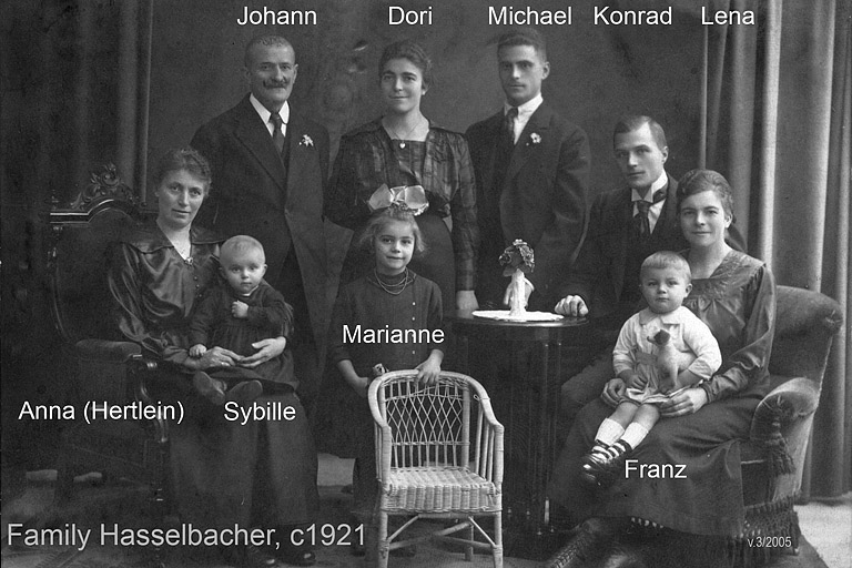The Hasselbachers of Nuremberg are my immediate Hasselbacher family. My Great-Grandfather Johann left Diespeck for Nürnberg around 1890 after his tour of duty in the Calvery. His two sons, Konrad and Michael married two sisters, Karolina and Dorothea Bayerl. Johann and Anna had a daughter Babetta who immigrated to the USA in 1912. (I think the empty chair is for her.) The two daughters of Michael and Dori each had a son who is still living in Germany. My father, Franz, was born in Nürnberg and immigrated to Bloomfield, New Jersey in 1925. |
