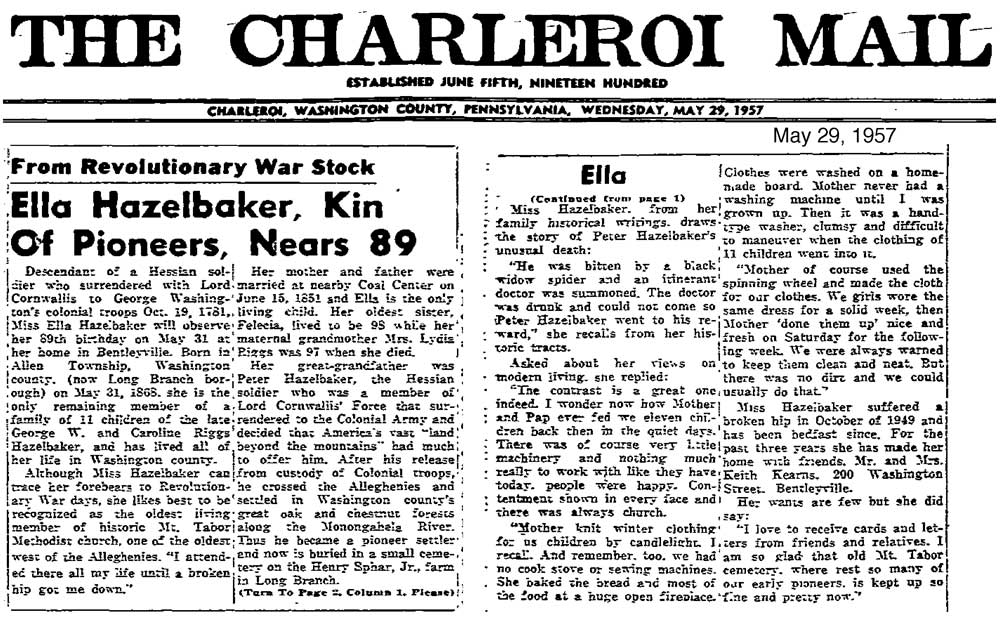 Hazelbaker Family History from Washington Co. PennsylvaniaThe Hazelbaker historian and contributor to this site, Jill Foley, collected this wonderful resource from the Citizen's Library in Washington, PA. It was prepared by members of a local church to which some Hazelbakers attended. It is particularly rich in lore about George Hazelbaker, one of Peter's sons. In fact, Jill sent us the Will of George Hazelbaker! It contains a version of the family history discussed by Jill from the 'Sketch" of L.B. Kinne. Jill and Greg Humphrey have been trying to find more about Mr. Kinne and have been successful (more about that later!). The present document is of particular interest in this regard because it confirms that Kinne was a Hazelbaker relation by marriage. He married a Great Granddaughter of Peter. As shown on p. 3 of the pdf document (p. 132 of the original), he married the daughter of Mary Hazelbaker Cooper. (The name "Kime" is Kinne misspelled.) I understand that there are some possible errors and misinterpretations in this material, but that is the nature of the genealogy game and why there is still work for us contemporaries. Also in the document is a survey of the Church Cemetery containing some Hazelbakers. Download the PDF document here. (14 pages 2.7 MB) Peter Hasselbacher Mar 30, 2010 Addendum: While browsing in Ancestry.com, I found this newspaper article describing the life of Ella Hazelbaker, Great-granddaughter of Peter Hazelbaker. Ella lived her entire long life in Washington County. (The text of the article had already been incorporated in to the notes of Jack White's database on this website.) Of interest is an alternate version of the story of how Peter died. Rather than poor doctoring, the drunk doctor did not come at all. "Family Historical Documents" are described. What are these? Does anyone have more of them?