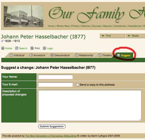 There is another way built into the software that I want to use. On all of the individual and family pages there is a “Suggest” tab.