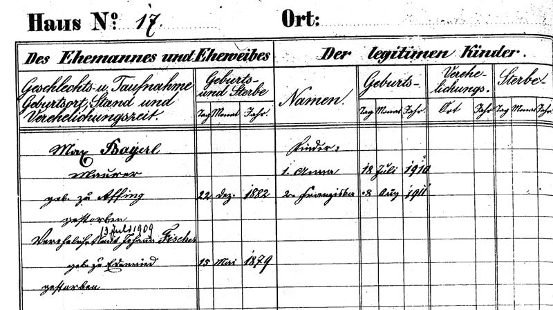 Max, a mason, had his register redone and I show it below. Note that Baÿerl is written with an umlaut for Leonhard, but without for Max in the 20th century– Deutsch-script above and Roman below.