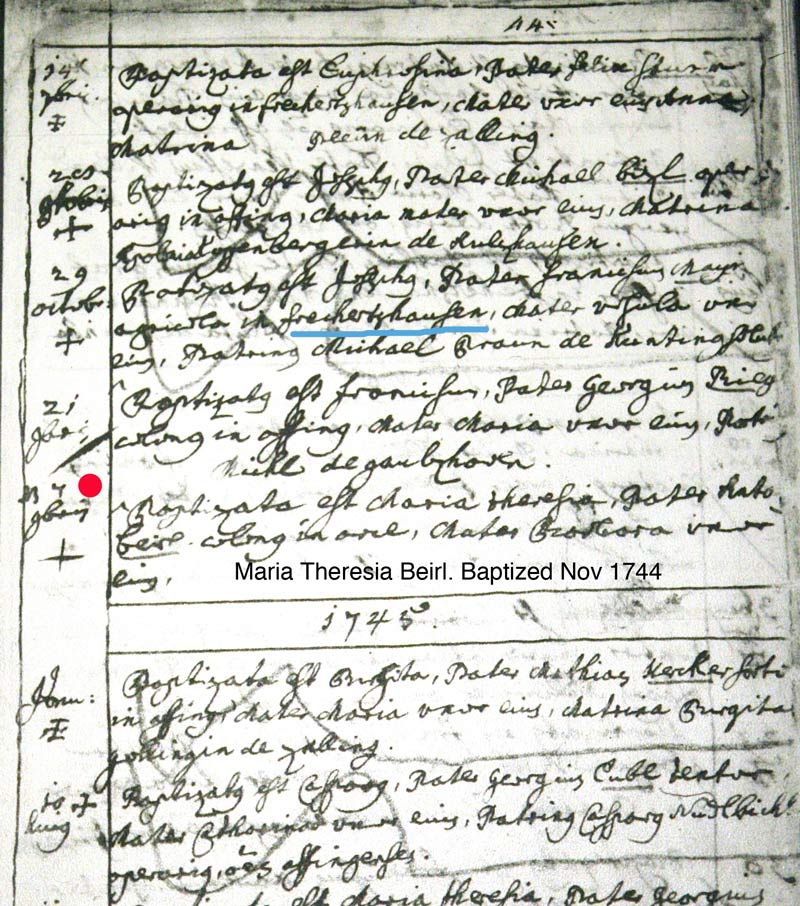 The second record below is dated November 4, 1744. (Red dot.) It is the baptism of Maria Theresa. Again I struggle with this handwriting. The father's name maybe Cato, a farmer in a village I cannot make out. The mother's name is Barbara. The cross by the date would indicate that the child died in infancy