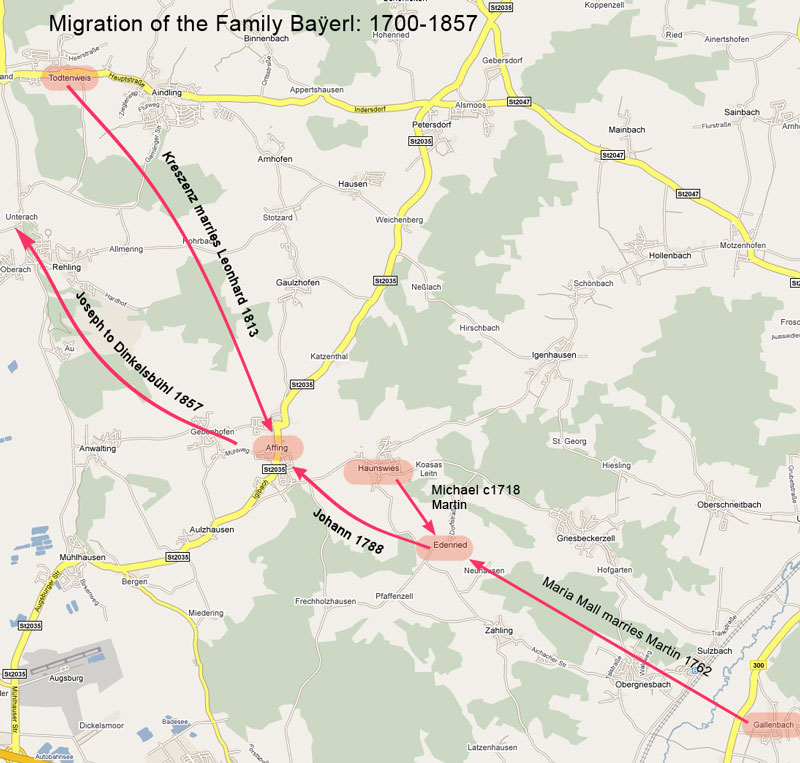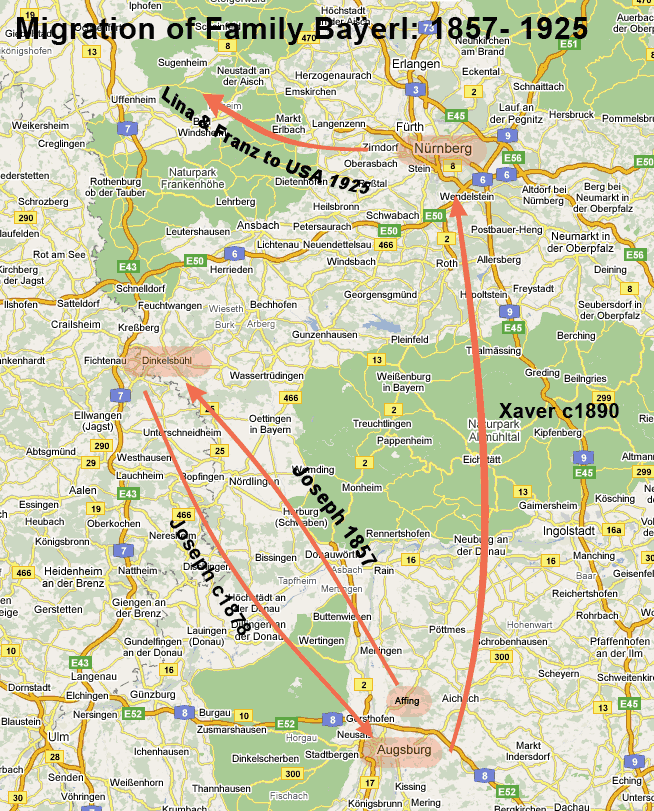 The following two maps depict the sequence of places in which my Baÿerl family lived. The earliest known place (so far) is Haunswies where my 6G-Grandfather Michael began his family and where 5G-Grandfather Martin was born. Martin's son Johann was born in Edenried and went to Affing where his son Leonhard married Kreszenz Helfer. Their son Joseph went to Dinkelsbühl where he and Karolina had my Great Grandfather Xaver. When Karolina died in 1878, Leonhard appears to have taken his family back to Augsburg. Xaver was 12 at the time. Xaver moves to Nuremberg by 1890 and has my Grandmother Carolina. Lena and my father Franz come to America in 1925 where I was born in 1946. There have been two generations in America since, but that is another map!