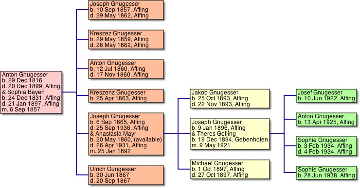 Below is a box chart of the Gnugessers of Affing. All but Anton himself are my blood relatives. Some of the boxes contain links to other pages. These can be revealed by moving your cursor over the boxes. The names Anton, Joseph, and Ulrich are very old Gnugesser names. I have recently extended the Gnugesser line back 3 generations in their ancestral grounds. Please see those results here.