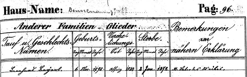 The entry just above summarizes the history of my GG Grandfather Leonhard who was born 1795 , married 1823, and died in this house in 1872. The comment on the far right reads "Vater des Weibes" or father of the wife.