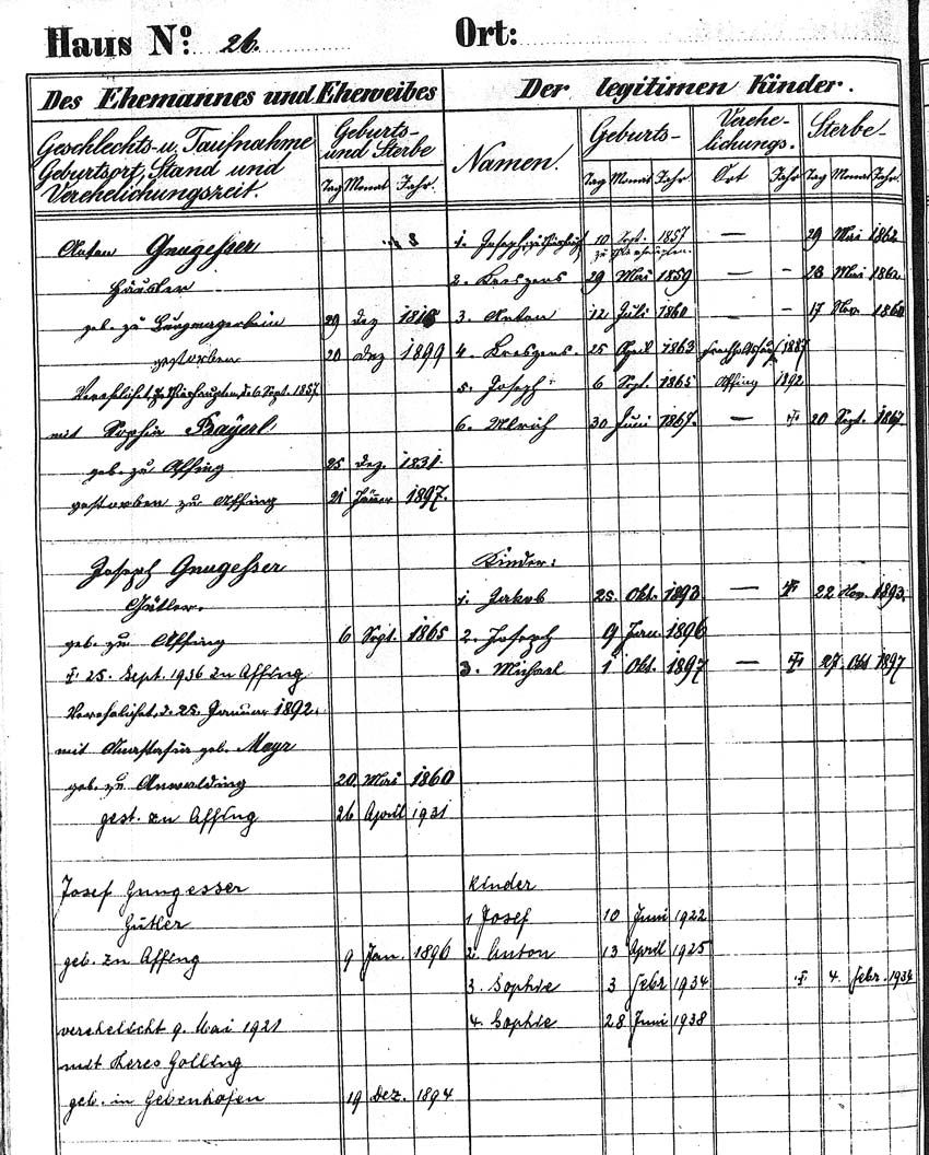 One of these, Great Grandson Joseph, was one of those who survived and who raised a family in the home of his grandfather. Great-grandson Joseph and his wife Theresa were having children as recently as 1938, including male children born in 1922 and 1925. It is likely that there are living Gnugessers of the Affing line but I have not yet found any.