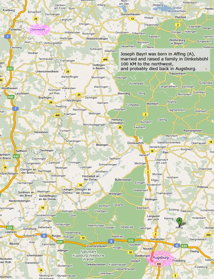 Joseph and Carolina are listed with nine children. Their details will be listed in the family tree sections of this site. Their first child, Joseph Karl, was born in 1856 before the marriage of his parents. Xaver is child #7. Of the others, two children born in 1859 and 1867 died in infancy. Significantly, there is no date of death listed for any of the other children, nor for Joseph himself. Neither is a second marriage listed for Joseph. It is reasonable to speculate that following the death of Carolina in 1878, that Joseph may have returned with his family to Augsburg where he lived in the final years of his life dying before 1890. Because of his occupation as a coachman or wagoner, Joseph would have been in a position to meet a woman in Dinkelsbühl, fall in love, and raise a family there. He may have returned to Affing/ Augsburg to remarry or benefit from the resources of other family in raising his children. There are many Bayerls living today in Germany, including some in Augsburg. There are only a handful of Bayrls.