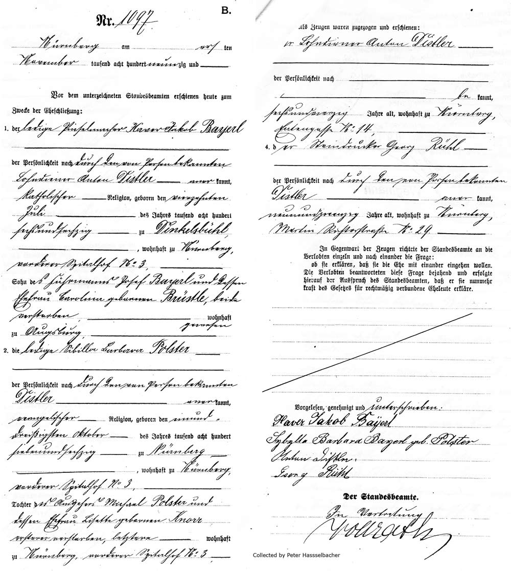 The largest increment of information came when in Nürnberg I found the 1890 marriage certificate of Xaver. He was described as a single (not previously married) brush maker (Pinselmacher) of the Catholic faith, born July 14, 1865 in Dinkelsbühl. He was living at Spitalhof #3. His father had been Josef Bayerl and his mother Carolina (maiden name Brüstle). Both his parents had already died (beide verstorben). Joseph had last lived in Augsburg where he was a coachman (Fuhrmanns).