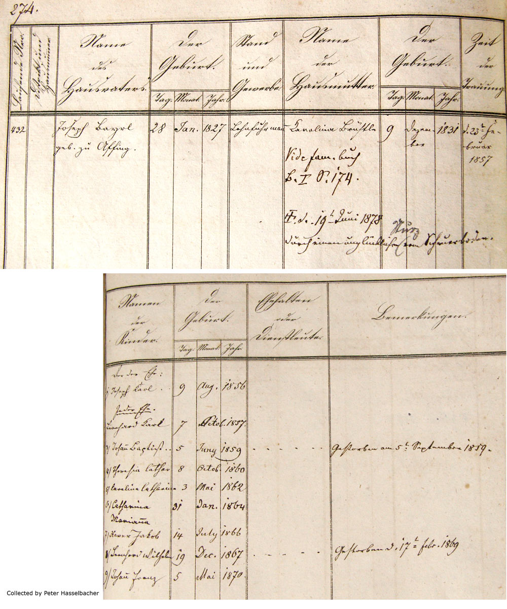 It is of interest that Xaver Jacob had a younger brother named Johann Franz (child #9), and an older sister named Katharina Marianna (child #6). These would have been the uncle and aunt of my Grandmother Lena (Karolina Katharina) and her sister Dorothy (both of whom married Hasselbacher brothers). Lena and Dorothy themselves had children named Franz and Marianna.