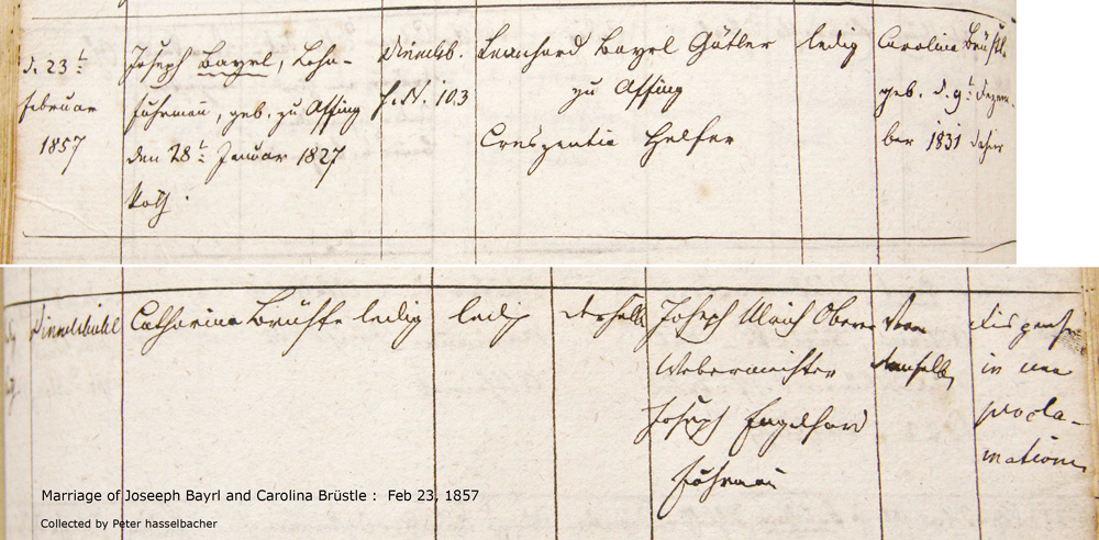 I was able to find the church books of Affing and have begun to work my way through them. (I will post the images soon.) Several important facts emerge immediately from the family registers of the mid 1800s. Leonard Baÿerl was born 6 Nov 1795 in Affing. (I will show his birth record here.) He was a häusler [cottager/ day-laborer] who lived in house number 6. His wife was Creszez Baÿerl, born Helfer from the village of Todtenwies just to the NW of Affing. The couple married 10 Feb 1823 and had 8 children, three of whom lived past childhood. All of those three, including Joseph, appear to have left Affing. The marriage record of the couple give the names of their parents: Johannis Baÿerl and Magdalena; and Xaver Helfer and Maria Anna of Todtenweis. Xaver is my GGGG Grandfather and it is likely he is the source of my father's middle name. [Addendum. Thee was an error in the church record. The father of Creszenz was not Xaver, but Joseph Helfer. Xaver was however a traditional Helfer name.]