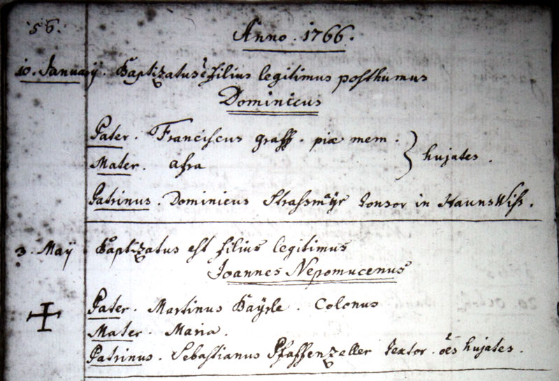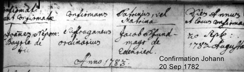 According to his marriage record in Affing, my 4G Grandfather Johann Bayerl was born in Edenried and his parents were Martin and Maria. You can imagine that I looked hard for a birth record for a Johann Baÿrlin the Edenried church books. The record below of the baptism of Johann Nepomuch is the only Baÿrl with a name of Johann listed in the index of births, or in any of the baptismal records that I looked at individually in Edenried. When I saw the cross in the margin, I assumed that it indicated that the child had died. A Johann Nepomuch was confirned in 1782 and I assumed (incorrectly) that he was a second child with the same name. However, I never found any additional records with the name Johann Nepomuch other than the 1766 baptismal and 1782 confirmation/suffraganaus record when Johann Nepomuch #1 would have been 16 years old.