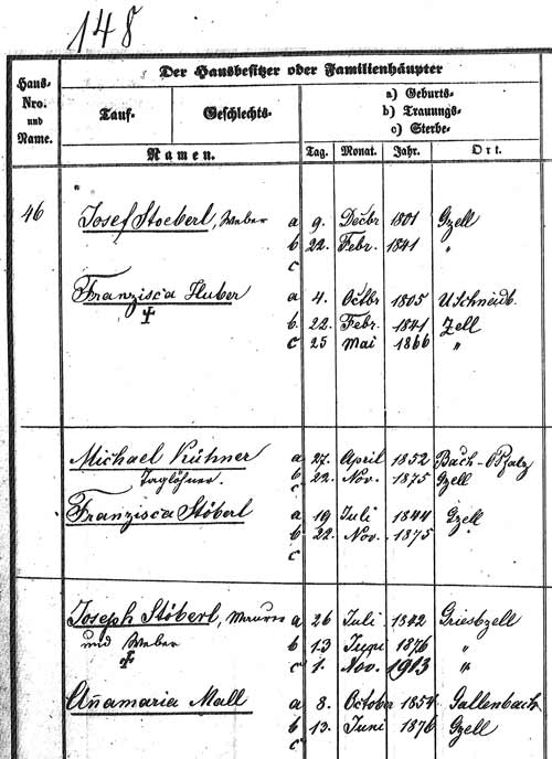 While looking through the church books of Griesbeckerzell (near Edenried) I found the following Family Register. It lists an Annamarie Mall who was born in Gallenbach in 1854 and moved into the neighborhood. This tells us only that Gallenbach was still producing Malls into the 19th Century!]