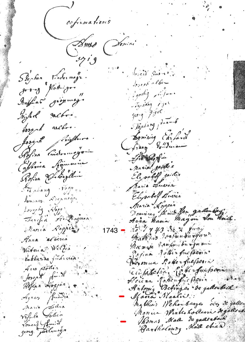 There is one additional record for a Maria Mall in Gallenbach, but it does not help much. The name Maria Maalin appears in a mostly undated list of confirmations occuring on or after 1743.