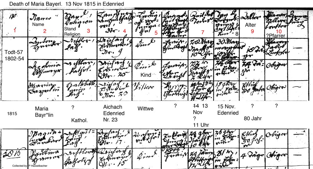 Maria's entry is the one just above my suggested translation insert. Column #1 tells us this is page 130 (in the Edenried death register of 1802- 1854.) Her name is spelled 'Bayerl or Bayrl(in).' Column #3 tells us she is a Halbbäuerin ['half-farmer' relates to size of the farm] and is Catholic. Column #4 gives the name of her administrative district, village, and house number 23. Column #5 tells of her family status of Witwe or widow but I cannot read the heading.