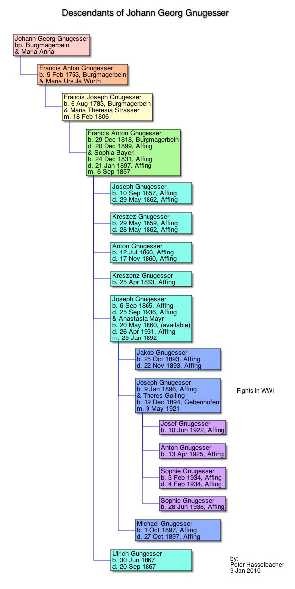 The Gnugessers in this initial 70 year period lived in the villages of: Burgmagerbein, Leitenhof, Reimertshof, Stillnau, Hochdorf, Kesselosthiem, Ziswingen and Merzingen. (I use the modern spelling of these villages.) Almost all are farmers or small farmers. Anton's father Francis Joseph Gnugesser had at least 9 children with his wife Maria Theresia Strasser. I initially thought this was Fr. Joseph's second marriage as there is an earlier Francis Joseph in the same village married to Maria Anna Raush. However, the ages don’t make sense yet. Further study is required for me to tie together the dozens of Gnugessers in the core villages. I know from other Gnugessers that some lived further south, closer to the Danube than the villages and farms above. However, their records seem to have been kept in another church. For starters, here is a straight-line ancestry of Anton of Affing with links to images of the original records.