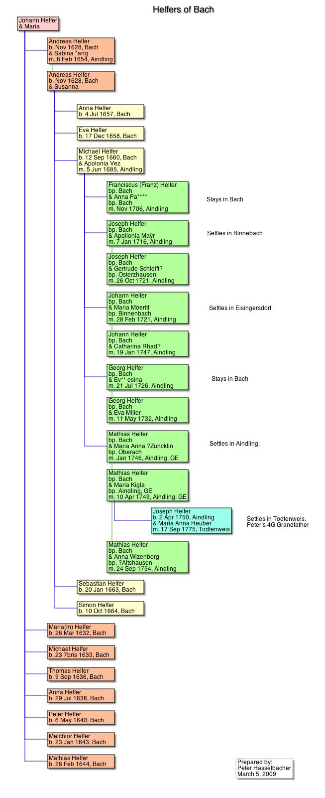 I was first led to look in Aindling, Bavaria because my 4G Grandfather Joseph Helfer was born there before he left for Todtenweis to found the large family (still living) there. The sacremental records from a number of small villages were kept in Aindling. Church records from Aindling permit a reconstruction of the genealogy and movements of the Helfer family in this area in the early 17th to the 18th centuries. I found baptismal records of Helfers in the village of Bach as early as 1628 with at least three families (this is one) having children before 1650. Look here for a general discussion of the Earliest Helfer Church Records from Aindling.) Here are the other two families.