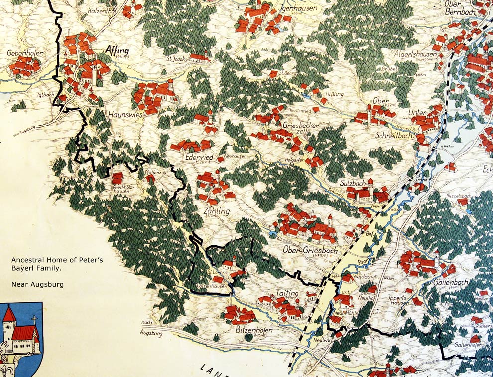 When I was in Germany last summer, I visited the castle in Affing. (There is still a Baron in Affing. I hope I get to meet him someday.) There was a wonderful old map on the wall that I photographed as best I could. The section below includes the ancestral homeland of my branch of the Baÿerl family. Specifically this includes the villages of Frecholzhausen, Haunswies, Edenried, and Affing . The Bayerl men married women from Gallenbach at the lower right, and from Todtenweis above and out of the frame.