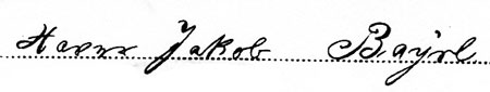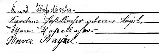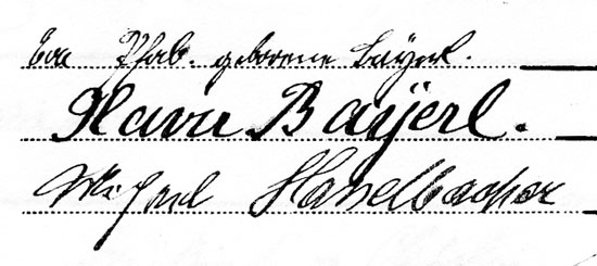 This signature comes from the 1893 birth record of Xaver's daughter Dorothea. If the diacritical mark over the 'y' was functioning as an umlaut that changed the sound of the letter below, this is what I would have expected: an absent 'e'. Otherwise the letters are written essentially the same. Of note, although the clerk writes 'Bayrl' without an 'e' he does not use a diacritic as Xaver himself does.