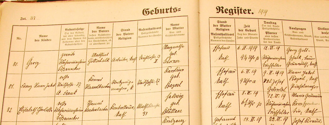 Above is the church-book entry of my father's baptism in 1919. (Click on image for full size.) There are no signatures attached, but I include it in his honor as Franz Xaver Jakob was named after his grandfather (and Godfather), but also to show that the writer spelled his grandfather's name as Bayerl.