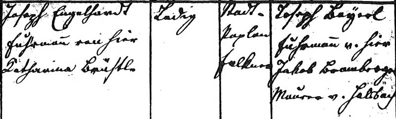 This is from the 1869 wedding of Josepha Catharine Engelhard. She is the half-sister of Joseph Baÿerl's wife Caroline. (Their mother is Catharine Brüstle Engelhard.) Note that the name of the witness Joseph Baÿerl uses the umlaut, but also adds the 'e."