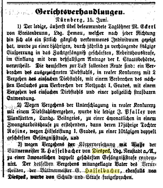 3) wegen Vergehens der Körperverletzung mit Waffe der Büttnermeister Andreas Hasselbacher von Diespeck, Lbg. Neustadt a./A., zu einer 3monatlichen doppelt geschärften Gefängnißstrafe condemnirt. Der desselben Vergehens mitangeklagte Vater des Verurtheilten, der Büttnermeister Georg Hasselbacher, ebenfalls von Diespeck, wurde von Schuld und Strafe freigesprochen.