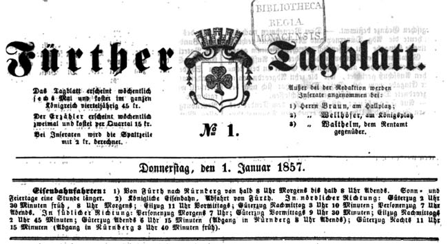 Andreas' father Georg was my 5G Uncle, and Andreas my 1st cousin 5 times removed. I have no idea how, when, or where Andreas got in trouble. The fact that the announcement was in a newspaper from Fürth (near Nürnberg) makes me wonder where he was living or working at the time. The date of the notice is 15 June 1857. Some other dates are informative. Andreas married Katharina Popp 1 year earlier on 3 June 1856. I have an abstract record of their marriage in Diespeck where the couple had their second child on 7 Feb 1857. Katharina was from Adelsdorf, 4 km. south of Markt Erlbach. Andreas and Katharina had their first child there as an unmarried couple in June 1852. I know from American census records that Katharina had lost a child. This child was named Freidrich presumably after his godfather and uncle Friederich Popp, but perhaps also for his father. I do not have a death record for little Friederich, but it may have been recorded as Freiderich Popp.