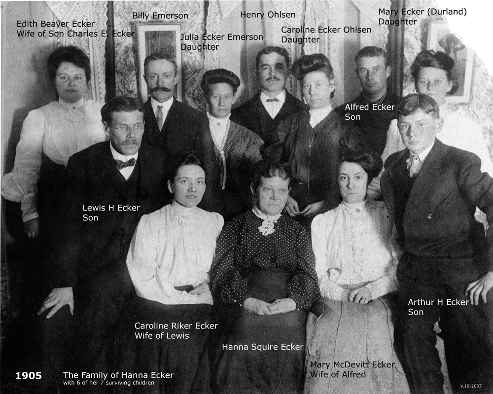 I was able to find and correspond with the grandchildren of Caroline Ecker and her husband Henry Ohlsen. They also had a copy of this photo, but with a different set of identifications written on the back by their Aunt Gussie (Agusta Ohlsen), the daughter of Henry and Caroline and granddaughter of Hanna Squire Ecker. This is what I had hoped would happen! I now believe I can identify everyone in the photo.