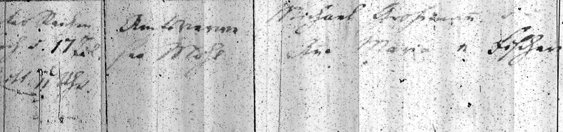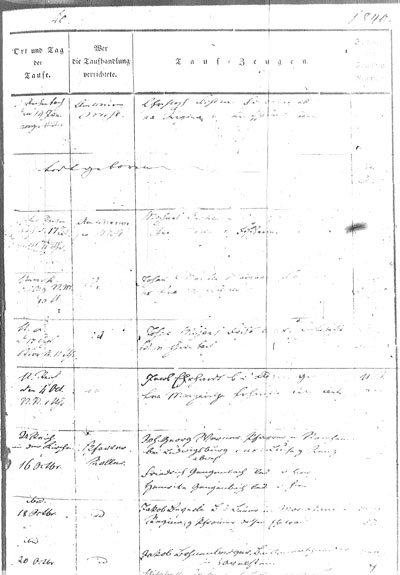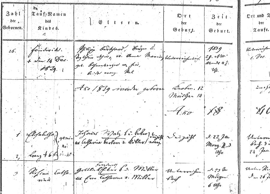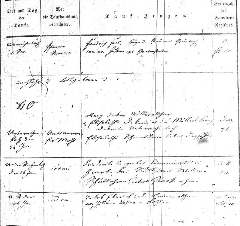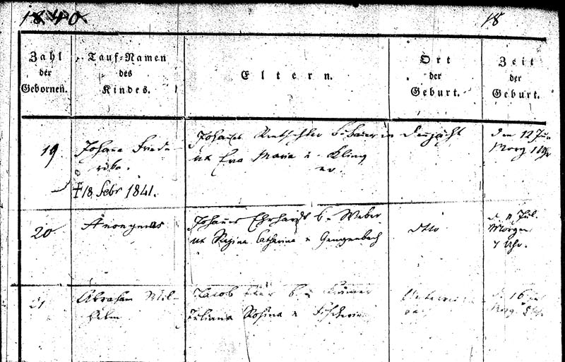 Below is the record for our Abraham Wilhelm Ecker. His was the 21st baptism in 1840 in this church-book. His parents are well known to us: Jakob and Juliana. Born in Unterreichenbach 16 July in the morning. The second page is difficult but bless Photoshop. William was baptized in Unterreichenbach 17 July but I cannot make out the third line there. The sponsors were Michael Grossmann?, and Anna Maria (name) Fischer, probably a relative of William’s mother. Since we have the Fischer family registries, I can probably figure out this relationship. For your interest, here is what the second page looked like before enhancement. |
