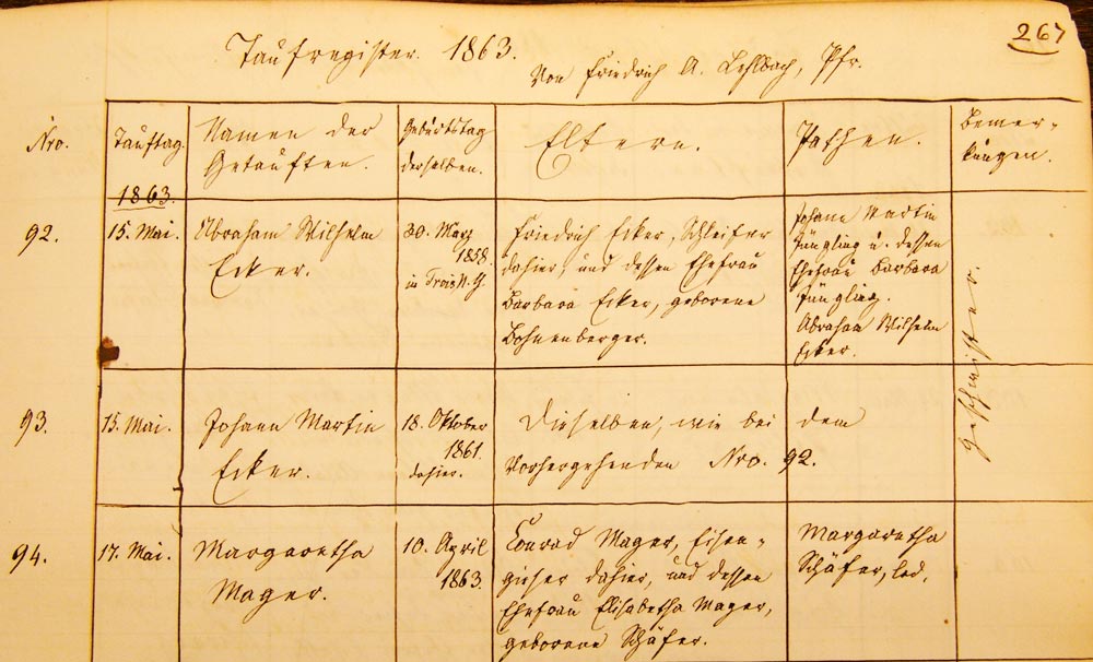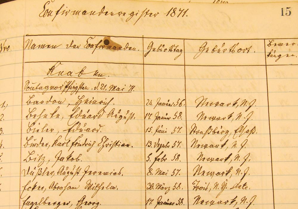 Item #92 for 1863 tells us that on May 15, 1863, Abraham Wilhelm Ecker was baptized. He was born May 30, 1858 in [sic] Trois N.Y. His parents were Frederick Ecker, schleifer, (grinder) and Barbara Ecker (Bohnenberger). Godparents were Johann Martin Jungling and his wife Barbara, and Abraham Wilhelm Ecker. On the same day, May 15, 1863, Johann Martin Ecker, born Oct 18, 1861, here is designated to have the same parents and godparents as #92. I cannot translate the designation yet, nor the word written at the right across both names. This is an interesting and important record. Two Ecker brothers are baptized on the same day, 5 and 2 years after their births. Of course, the Civil War was going on, and their father, Friedrich Ecker and uncle, Abraham Wilhelm Ecker had both served beginning May 28, 1861. Frederick was wounded for the second time (and more seriously) on Aug 27, 1862. He was discharged Jan 8, 1863. His brother Abraham mustered in at the same time, and was mustered out Aug 5, 1864. Thus, Abraham Wilhelm would have been born 3 years before his father went to war, but Johann Martin was born 4 months after! The older son was born in upstate-New York, and the younger in Newark. Friedrich would have been home for this baptism. Williams Civil War records appear to indicate that he was still on duty and on the Muster Roll May and June of 1863. I do not know if "leaves" were possible or if his physical presence would have been needed to serve as a Godfather to a nephew obviously named for him. This is a second piece of evidence that the New Eckers had some sort of history or connection to the area around Albany. Frederick (or at least Barbara) was there after 1857 (death of Juliana Rosina) and by 1858 for an undetermined period, and before 1860 when Caroline was born in Newark. In 1858, Uncle Abraham William would have been 18 and might have accompanied his brother Frederick. Frederick moves from being a goldsmith to being a more heavy duty sounding "grinder" in this period. Perhaps William became a file cutter at the same time. A confirmation record (Item 7) for Abraham Wilhelm is shown below. It confirms the date and location of birth. Confirmation May 21, 1871. |
