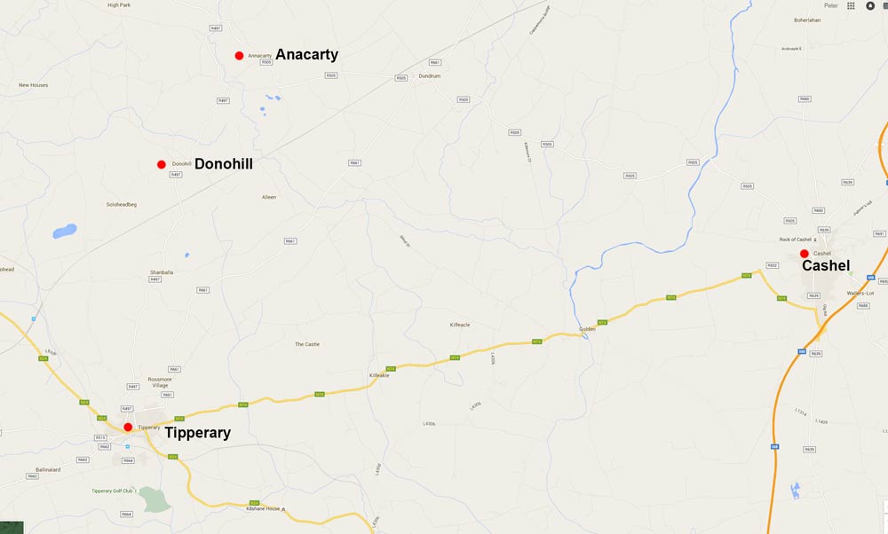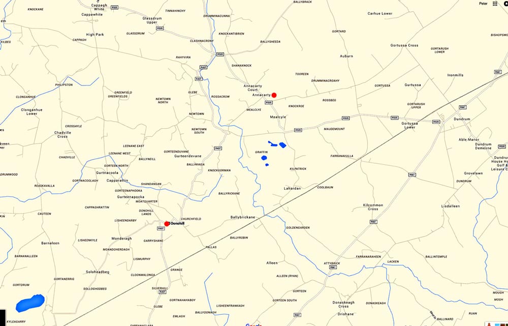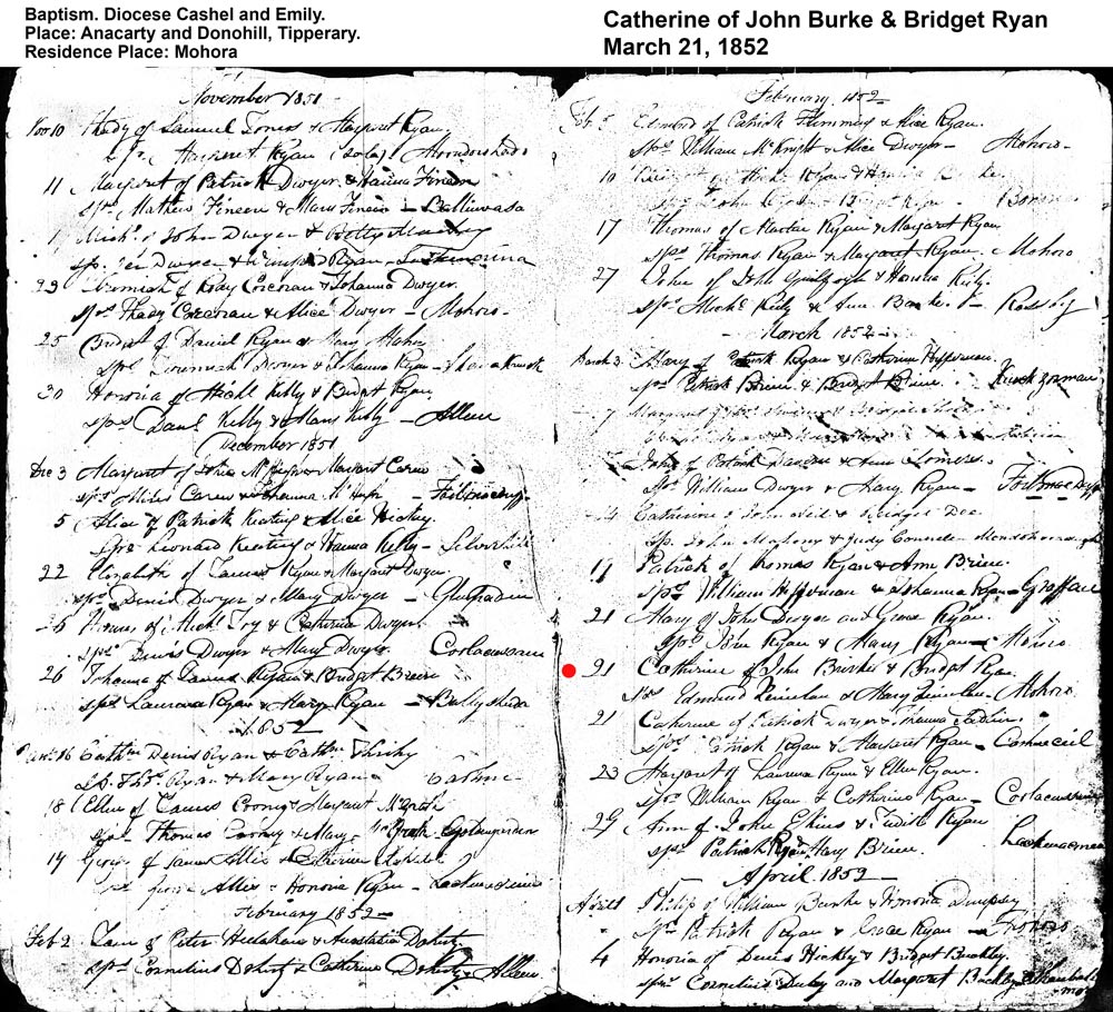 All but the name of the specific place they lived, Mohora, is still present on Maps of Ireland. I am in hopes that when I write or visit, the old site can be identified. On the map today, the place names in the area identify single or a handful of houses. I am also in hopes that the old church-books with the full entries are still around. With luck, there will be civil records of life or immigration. Browsing through the registry, there seem to be other children of John and Bridget, although not in exactly the same location.