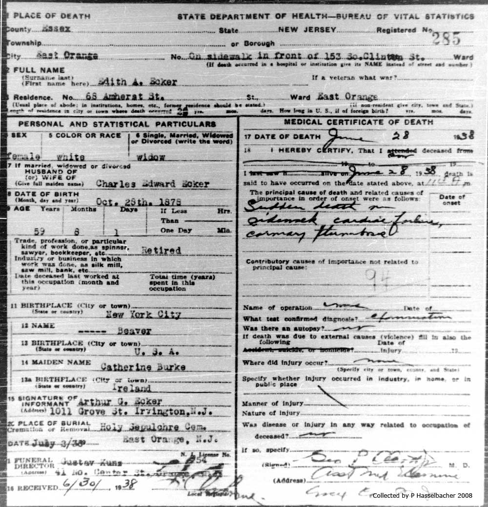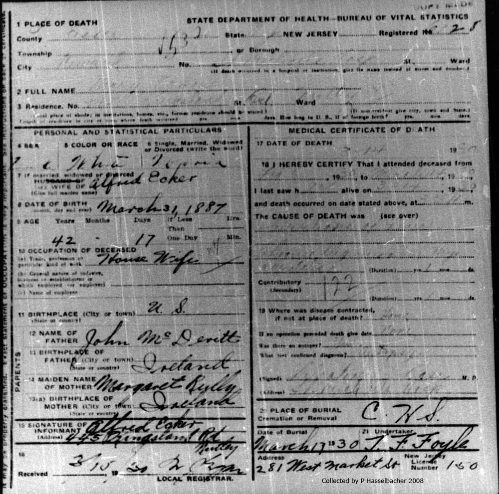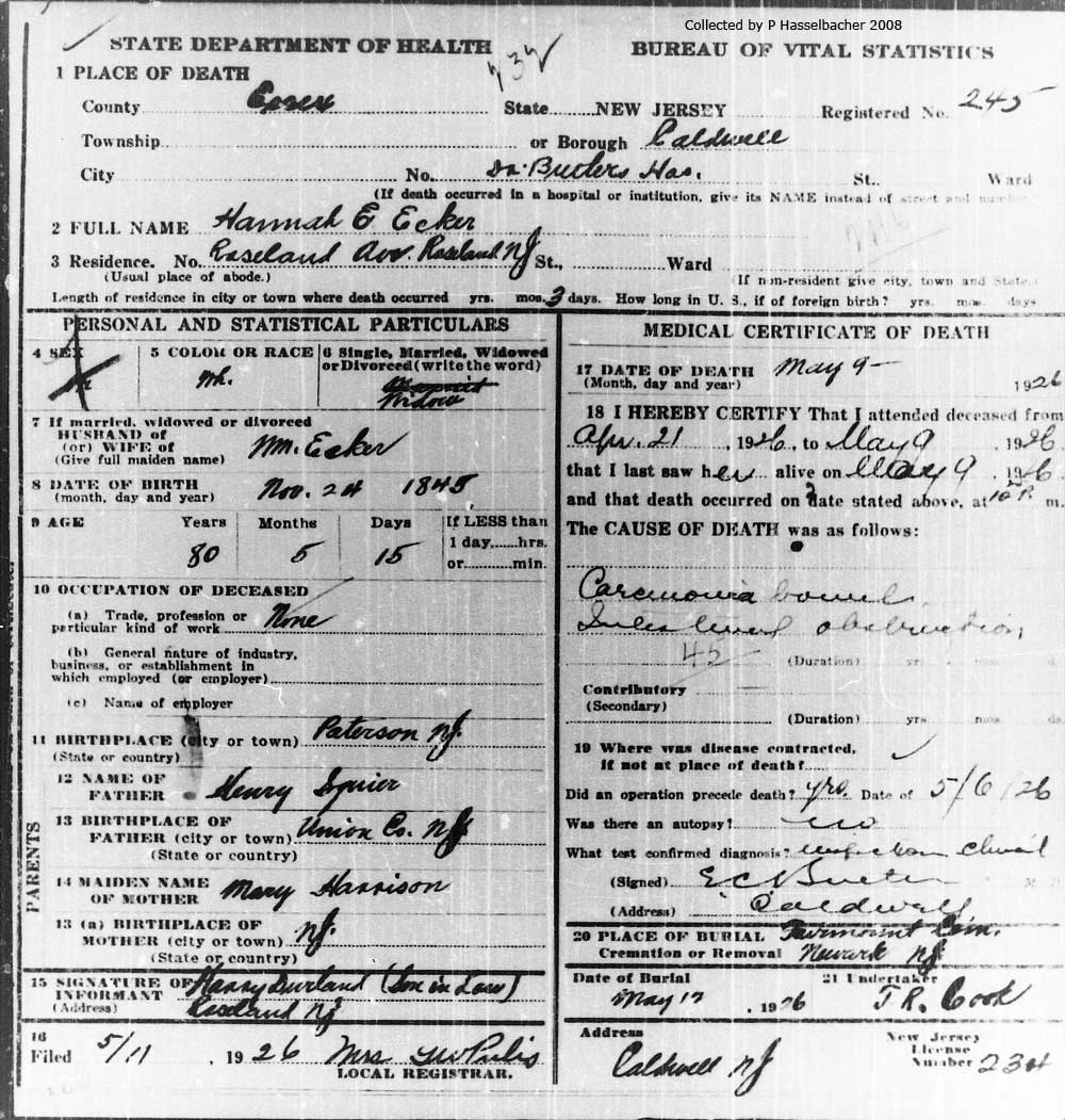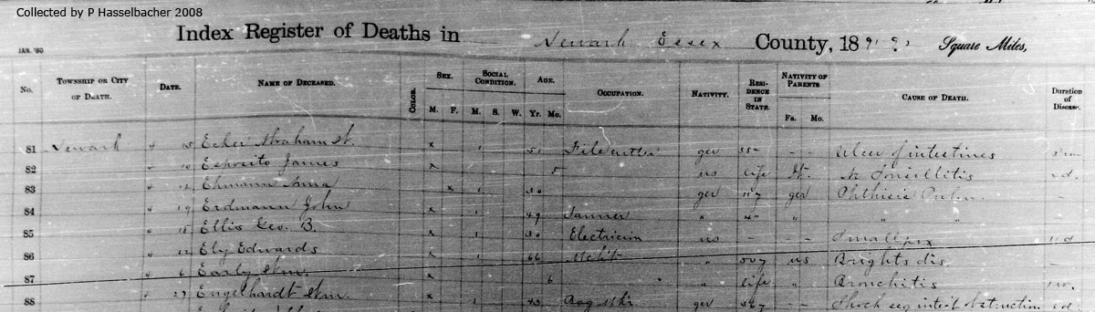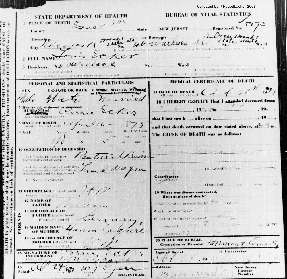 These certificates were culled from the State Archives in Trenton. They represent a systematic search for the Ecker name from 1900 to 1940. The microfilm rolls for those years arrange the certificates alphabetically for the entire year so the chances are good that all are accounted for. Time did not permit further search of earlier years so there are undoubtedly additional records to be copied. The county of death was recorded. It remains to be determined what additional family relationships are present. It seems certain that not all these Eckers are related. If you have an interest in one of the names for which I have not yet uploaded a certificate, let me know. Many Eckert family files were copied by me and are also available to interested persons. |