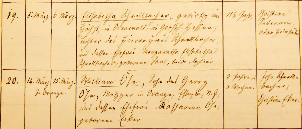 This is an interesting record. I may have been lucky to have found it. I scanned almost every page of the many dozen volumes of old books looking for the name Ecker. I obviously focused on the main name column or where a main name was underlined. I probably saw this because I had seen the name Öse (Oese) as a godparent for an Ecker. In any case, I have always wondered what became of the Margaret Ecker who immigrated with William in 1854. This might have been her. The pair of 14 year-olds came over with (escorted by?) an Elizabeth Bohnenberger who was 21 and would have been born in 1833. This is 10 years too young to have been Frederic's Barbara. Unfortunately, my initial hopes are not likely, although a more distant relationship is possible. (Addendum: Mystery solved. See below for the answer!!!.) On March 14, 1859, William Öse died. He was the son of Georg Öse a Metzger (butcher) in Orange, Essex Co., NJ; and his wife Katharina Öse geborenn Ecker. William was 3 years and 3 months old. That would give an estimated date of birth of Jan 1857. Witnesses were Johann someone and Christian Ecker. Could Katharina Oese have been Rosina Katharina Eker born Jan 23, 1840? Rosina was first cousin to my Abraham Wilhelm and was confirmed in the same class in Germany. I was quick to assume that it was she that immigrated. However, her family registry page from Unterreichenbach has an asterisk by her name and a notation that there was a illegitimate child born in 1865 that seems to be hers. The name and date make her an unlikely candidate. I found an entry in the index of marriages in NJ for Catharine Ecker and George Christian Oese that has them wed in Newark Nov 13, 1853. Thus, she was here before William. Furthermore, an 1860 census report says that both she and George were born in Hesse, Germany. Catherine was 25 in 1860 which gives her a birth year about 1835. My hypotheses are circling the drain. Still, the large Ecker clan in Rensealler Co, NY, just across the river from Albany and Troy were from Hesse also. It might be that Hesse was an intermediate stop for some Eckers from Unterreichenbach coming to America. (Where is Hesse, and where was it in the mid 1800's?) Addendum 3/8/2008: The answer to the mystery above was right under my nose. Katharina Ecker Öse is Regina Catharina Ecker, the sister of William, Friedrich, Jakob, and Christian. No wonder they were godparents and witnesses for each others children and marriages! Regina Catharina (as her name appears in the Unterreichenbach church book) was born 3 Jul 1835 and was confirmed 22 April 1849. I should have been more alert when I origainally saw that there were no marrige or death dates on her Family Registry Page where she is child #4. Thus it was that all the surviving children of Jakob Ecker and Julianna Rosina Fischer came to America in the middle of the 1800s. Their father died in 1845 and had ceased being a miller before that, perhaps due to illness. Perhaps the loss of the "family business" contributed to the immigration. I point out that several of the Eckers, including Barbara, also settled in Orange and East Orange and were in the grocery business. It is a good fit that butcher Georg and his wife may have been part of the family enterprise. The Oese Eckers and the Bohnenberger Eckers obviously knew each other in Newark. I also got a thrill when I saw the first entry above. I first took it for Elizabetha Hasselbacher, but is is probably Schuellbacher. (Note that the name of the witness for Williams death appears also to be Schuellbacher.) I am missing some Elizabeth Hasselbachers. The tale is told elsewhere on this site. |