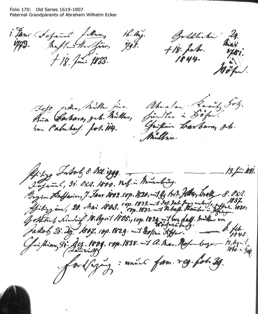 This is the family register of the Paternal Grandparents of our American William Ecker. [Refer to Folio 43 for more detailed description of the structure of the Family Register pages.] The father of the family is Johannes Ecker, Born 1 Jan 1773 and who dies 18 Jun 1833. He is a maltmiller In Unterreichenbach. He was married in 16 Aug 1798 to Gottlieben who was born on 24 Mar 1787 and died 18 Feb 1844. The name of her birthplace was a struggle, but her father's home below makes it possible to identify Höten (a small town on the map and near Calmbach.)