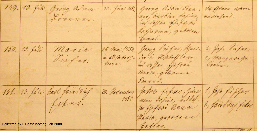 Baptism of son, Karl Friedrich | Born 1853, baptized 1854. Baptismal record from German Church in Newark. Witnesses included Jakob's brother, Friedrich Ecker who was himself married the following year. The date of 1853 suggests that Jacob immigrated before that year. |