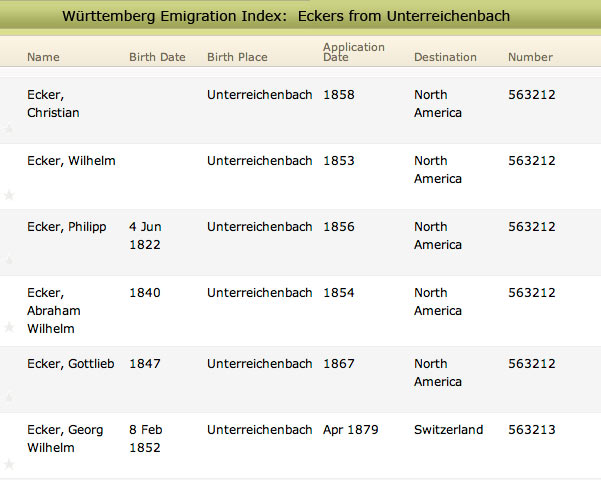 Many Eckers left Unterreichenbach for other German villages and towns. I have no way of knowing how many made the bigger jump to another country.