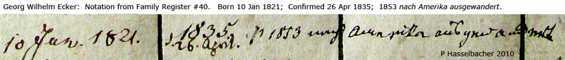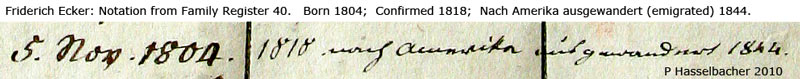 Child #2 is Friderich, born in 1804 and confirmed in 1818 at the usual age of 14. Following the confirmation entry is the notation shown in detail just below. The important word is ausgewandert indicating emigration. In this case, the destination in 1844 is clearly given: Amerika. Friderich at age 40 is the first Ecker I have identified so far who came to America. There is no indication that he married in Unterreichenbach as is the case, for example, for children #6-8.