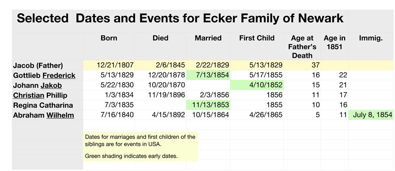 We do not yet know if the four older siblings came over together, although that is quite possible. I recently took another look at the "Germans to America" reference series by Glazier and Filby in which I found the record of Abraham William's emigration. Volume 1 begins with January 1850. I could not find compatible entries for the older Ecker siblings between 1850 and Aug 1854. Of course, they could have come over before 1850. Passenger lists are not perfect either.