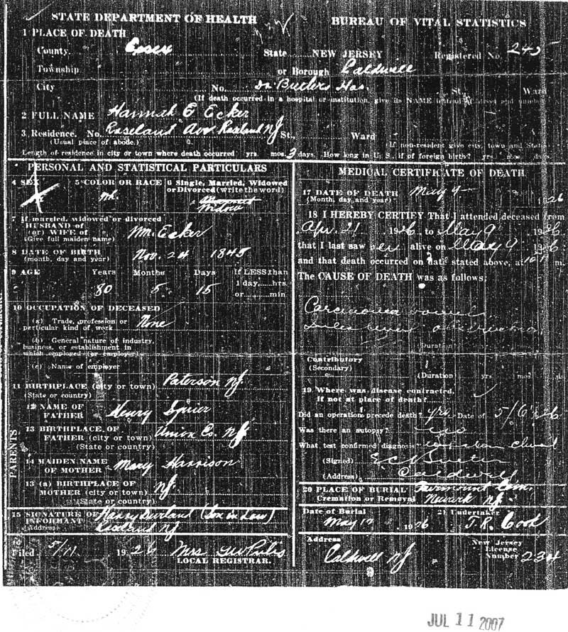 Death Certificate- Hannah 1926 | Roseland, NJ |