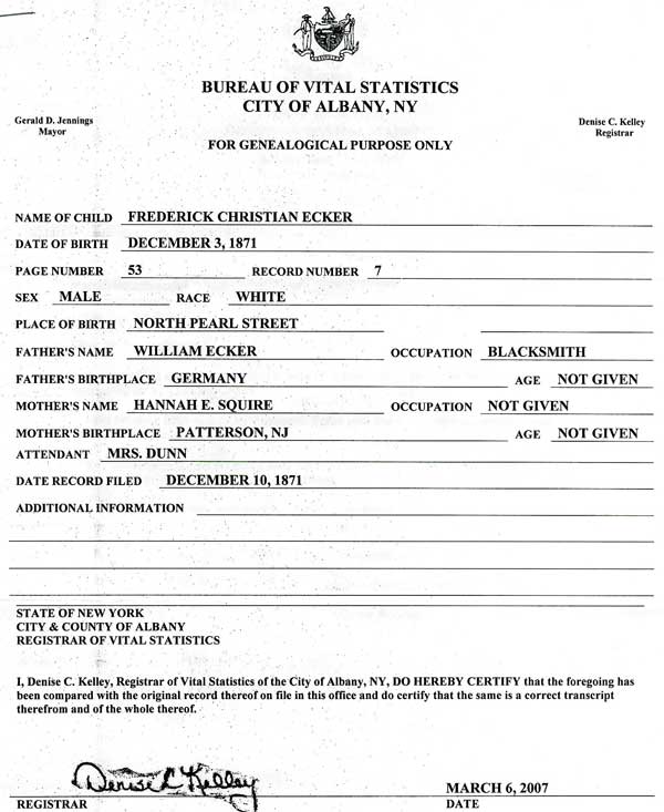 Birth Record Frederick Christian Ecker | Son of William and Hannah born Albany, NY in 1871. |