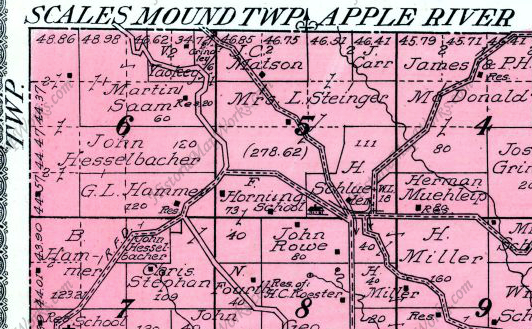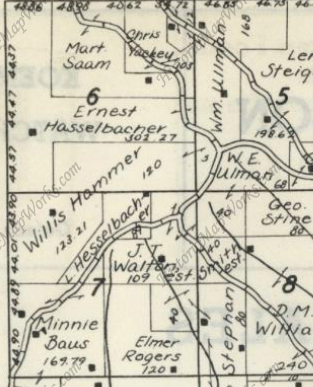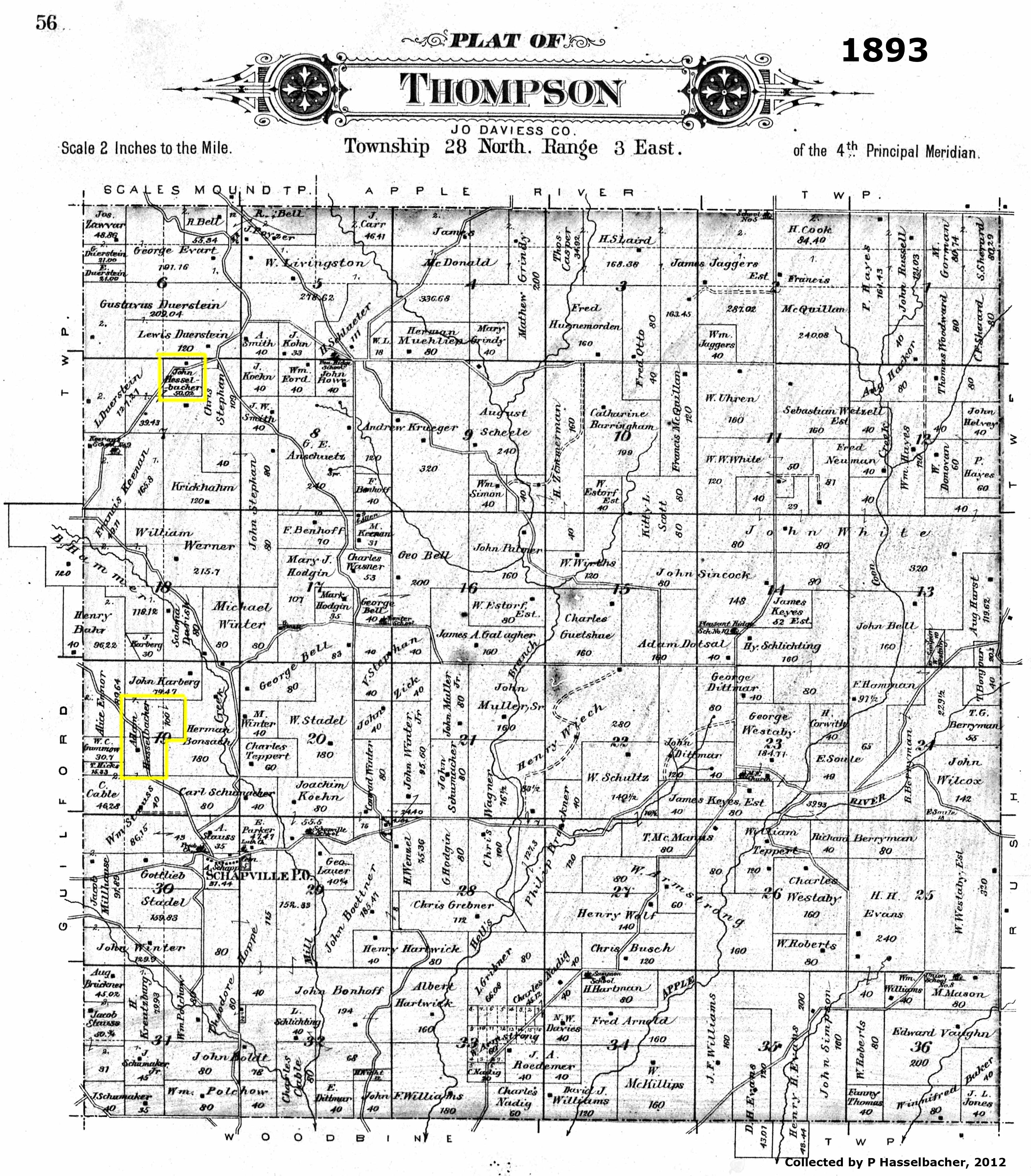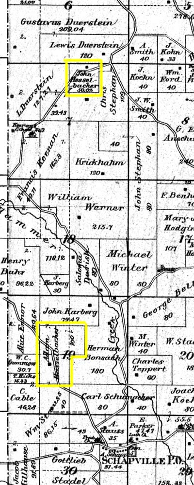 I originally stumbled upon the Hasselbachers and Hesselbachers of Jo Daviess County, Illinois when I found the map just below. In the northwest corner of Thompson Township near Scales Mound Township is a small farm belonging to John Hesselbacher. Further south is a farm belonging to Adam Hasselbacher. On the next map available to me in 1913, the Adam Hasselbacher farm has already passed transferred ownership to G.S. Anschutz and will change hands several more times over the years. However, the John Hesselbacher farm enlarges and appears to split. The larger portion remains under the family name until 1988 when it appears to be taken over by banks.