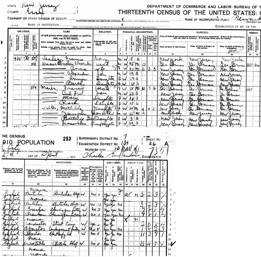 Living in the same house is Francis Maier who also immigrated from Germany in 1880. The house is 488 Bergen Rd. in the City of Newark.
